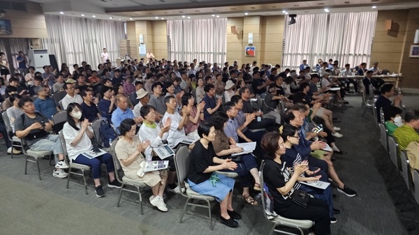 과천문원청계마을 재개발 설명회에 참석한 주민들이 박수를 치고 있다. 사진=문원청계마을 재개발준비위
