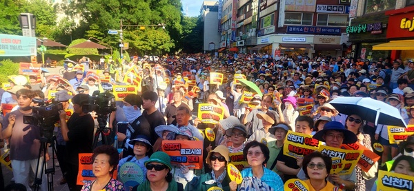 과천시민총궐기대회 참가자들이 12일 뙤약볕 아래 손팻말 등을 들고 빼곡히 모여있다. 사진=이슈게이트