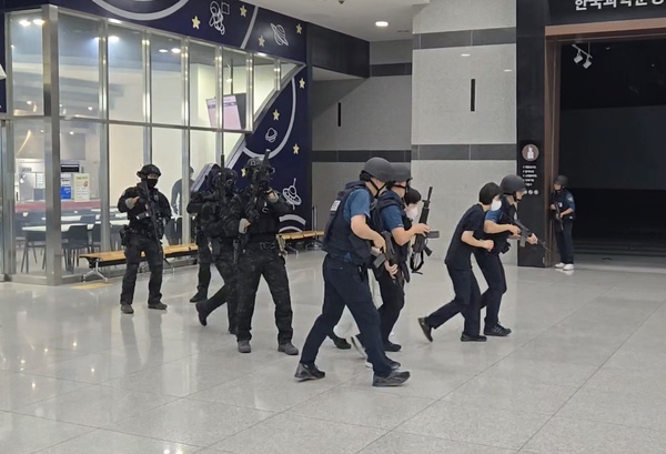 이번 훈련은 다중운집시설 내 총기 테러·시설 점거, 인질 상황을 가정해, 경찰의 현장통제 및 상황 파악, 소방·보건의 부상자 구호에 이어, 특공대의 테러범 사살과 인질 구호로 상황을 마무리했다.