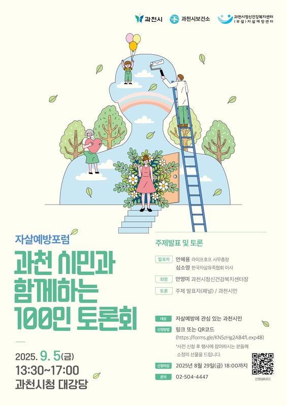 과천시정신건강복지센터 부설 자살예방센터는 자살예방의 날(9월 10일)을 앞두고, 9월 5일 오후 2시 시청 대강당에서 ‘자살 예방 포럼-과천시민과 함께하는 100인 토론회’를 개최한다.