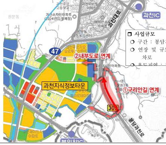 과천시 서면공개에 따르면 과천지식정보타운(과천지정타) 연결도로 2개소는 △지식정보타운~교육원로 연결도로 0.85km 구간△ 지식정보타운~봉담과천로 진출입로 0.42km 구간 진출램프 개설이다.
