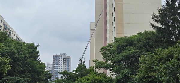 과천시 주공5단지 아파트에 사다리차가 걸쳐져 있다. 이슈게이트