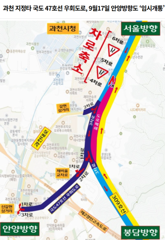 과천시 관계자는 “임시개통 초기엔 봉담로와 47번 우회도로 진입로에서 차량 정체가 있을 수 있다”라며 “표지판을 숙지하고 차로변경에 유의하는 안전운전이 필요하다”고 밝혔다.