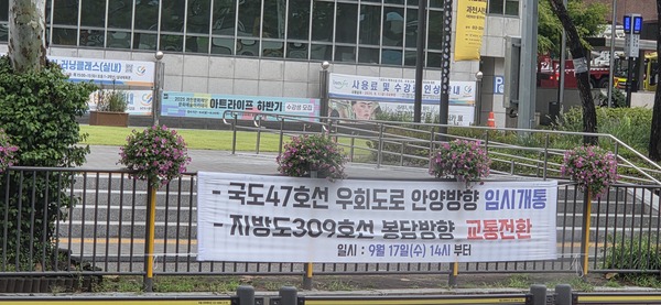 지방도 309호선 봉담방향 교통전환을 강조하는 현수막이 과천시내에 내걸려 있다. 사진=이슈게이트