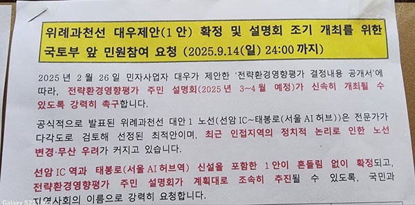 정부가 9월초 2026년도 임대형 민자사업(BTL) 국가사업으로 위례과천선 한도액을 1조1209억원으로 편성, 국회에 제출하면서 위과선 추진의지를 보여주자, 서초구 일부 주민들은 위례과천선광역철도역사유치추진위원회 명의로 주민들에게 국토부 압박을 위한 민원제출을 독려하고 나선 것으로 알려졌다.