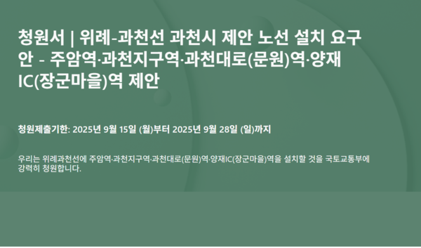 과천시민들이 위례과천선 관련 과천시 제안 노선 설치 관철을 위한 온라인 청원 서명에 나선다. 기간은 16일(화)부터 28일(일)까지 2주간이다. 과천시의회가 앞장서고 있다.