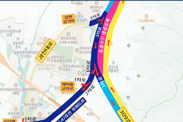 과천대로 래미안슈르 단지 옆 교통흐름도. 봉담방향과 안양방향 차량이 엉키지 않도록 조치해야할 것으로 보인다. 사진=과천시홈페이지캡처