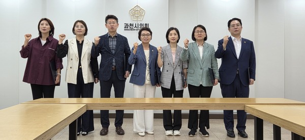 발표회견장엔 (왼쪽부터) 우윤화 과천시의회 시의원, 황선희 부의장, 국민의힘 최기식 당협위원장, 과천시의회 하영주 의장, 박주리 시의원, 이주연 시의원, 경기도의회 김현석 도의원이 참석했다. 불참한 이소영 지역구 국회의원, 김진웅 윤미현 시의원도 공동의견서에 동의했다고 시의회는 전했다.