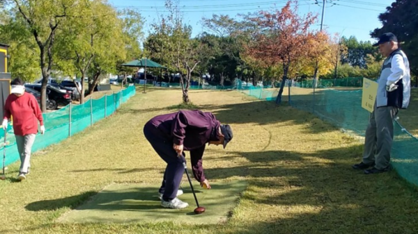 과천관문파크골프장에서 한 참가자가 티샷을 준비하고 있다. 과천시는 스크린파크골프장도 조성한다. 글사진=이슈게이트