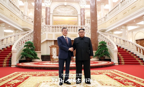두 남북 정상은 18일 오후 3시45분부터 5시45분까지 두 시간동안 노동당 중앙청사에서 회담을 가졌다. 문 대통령은 회담장 로비에 설치된 책상 앞 의자에 앉아 방명록에 '평화와 번영으로 겨레의 마음은 하나! 2018.9.18. 대한민국 대통령 문재인'이라고 적었다.