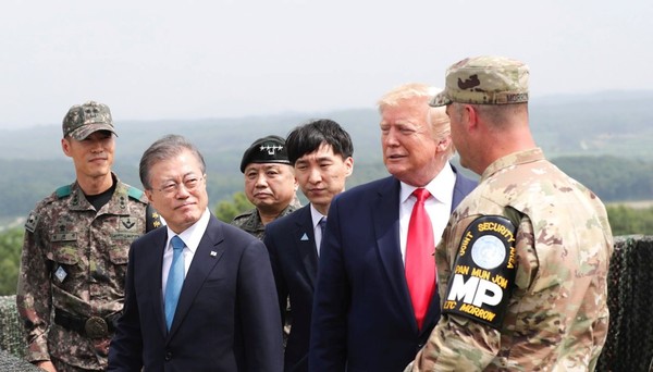 앞서 트럼프 대통령은 문 대통령과 군사분계선(MDL) 인근의 오울렛 초소와 공동경비구역(JSA) 대대장병들의 주둔지인 보니파스 캠프를 방문했다. 그는 "이 곳은 굉장히 위험했었는데 우리 정상회담으로 위험이 사라지고 안전해졌다"고 말했다.