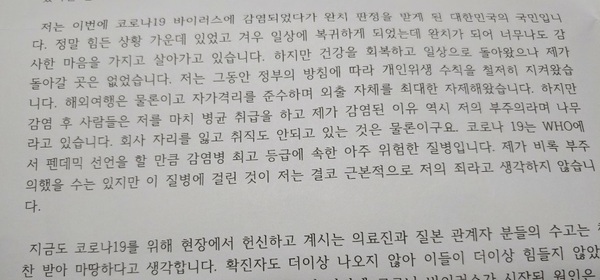 자신을 코로나 19 확진을 받고 완치된 대한민국 국민이라고 밝힌 정모씨는 "정말 힘든 상황에 있었고, 완치가 돼 너무나도 감사한 마음을 가지고 살아가고 있다"며 자신을 소개했다.