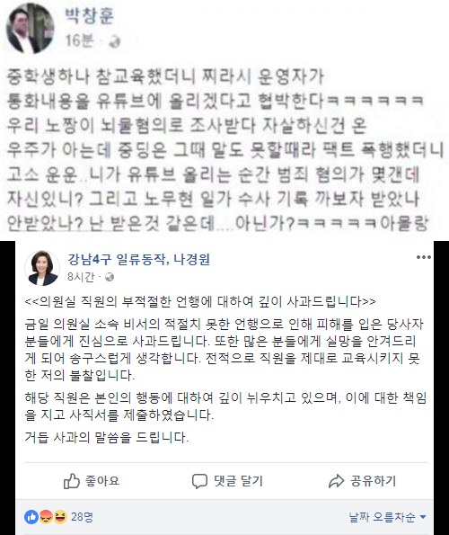 박 전 비서와 언쟁은 지난달에도 있었다. 그는 4월 28일 페이스북에 "오늘 나 의원실, 박창훈 비서가 겁박성 얘기를 했다"며 "저는 사실 만을 가지고 나경원을 까는 그런 사람이다. 나 의원이 잘못했으면 까이고 잘했으면 칭찬 듣고 하는 게 진정한 의정평가이자 구민의 자유권"이라고 말했다.