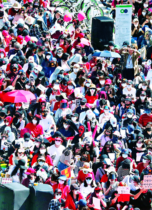여성의 피해의식과 경찰의 억울함은 사실 같은 데서 출발한다. 남성의 몰카 범죄가 그만큼 횡행한다는 거다. 곳곳에서 표적이 되니 여성들은 불안한 건데 워낙 흔하다 보니 경찰은 대수롭지 않게 여기는 것이다. 개가 사람을 문 거다. 검찰과 법원의 처벌 의지도 강하지 않다. 집회에서 여성들이 내민 증거를 보면 그렇다. “몰카 460회 찍은 남성 회사원 집행유예/183명 몰카 찍은 남자 의대생 기소유예/여자 탈의실 찍은 남성 국가대표선수 자백 불구 무죄/몰카 찍은 남성 판사 4개월째 수사 진척 없음.”